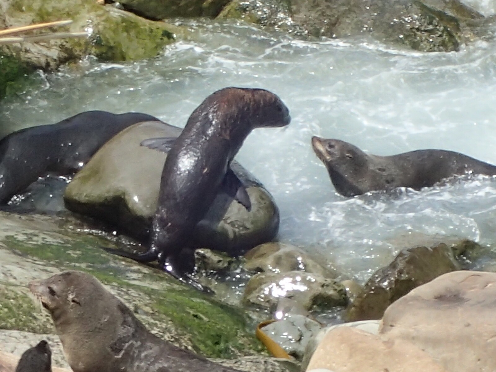 Viel weiter sind wir dann nicht gekommen – in Nin’s Bin erfuhren wir, dass wenige Kilometer weiter eine Seehund-Kolonie an der Straße ist. Mit diesen putzigen Gefährten hatten wir ja schon ein paar Begegnungen, ließen es uns aber nicht nehmen, abermals Halt zu machen und eine Weile die älteren Herren beim gemütlichen Relaxen am sonnenbeschienenen Felsen zu beobachten, umgeben von ebenso tiefentspannten Damen, die mit großer Geduld ihre Kleinsten davon abzuhalten versuchen, allzu früh in’s kühle Nass einzutauchen sowie ausgelassenen halbwüchsigen Rackern, die bereits alt genug waren, ohne Aufsicht im Wasser herumzutollen und zu rangeln.