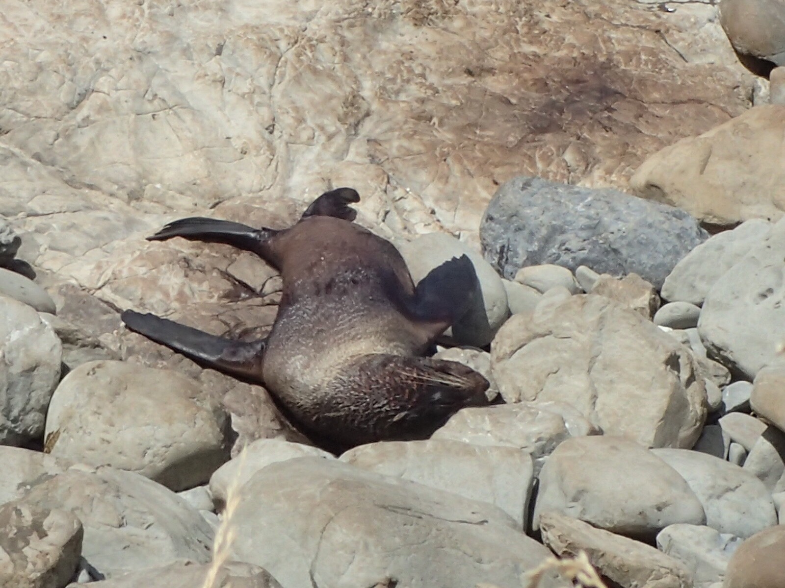 Viel weiter sind wir dann nicht gekommen – in Nin’s Bin erfuhren wir, dass wenige Kilometer weiter eine Seehund-Kolonie an der Straße ist. Mit diesen putzigen Gefährten hatten wir ja schon ein paar Begegnungen, ließen es uns aber nicht nehmen, abermals Halt zu machen und eine Weile die älteren Herren beim gemütlichen Relaxen am sonnenbeschienenen Felsen zu beobachten, umgeben von ebenso tiefentspannten Damen, die mit großer Geduld ihre Kleinsten davon abzuhalten versuchen, allzu früh in’s kühle Nass einzutauchen sowie ausgelassenen halbwüchsigen Rackern, die bereits alt genug waren, ohne Aufsicht im Wasser herumzutollen und zu rangeln.