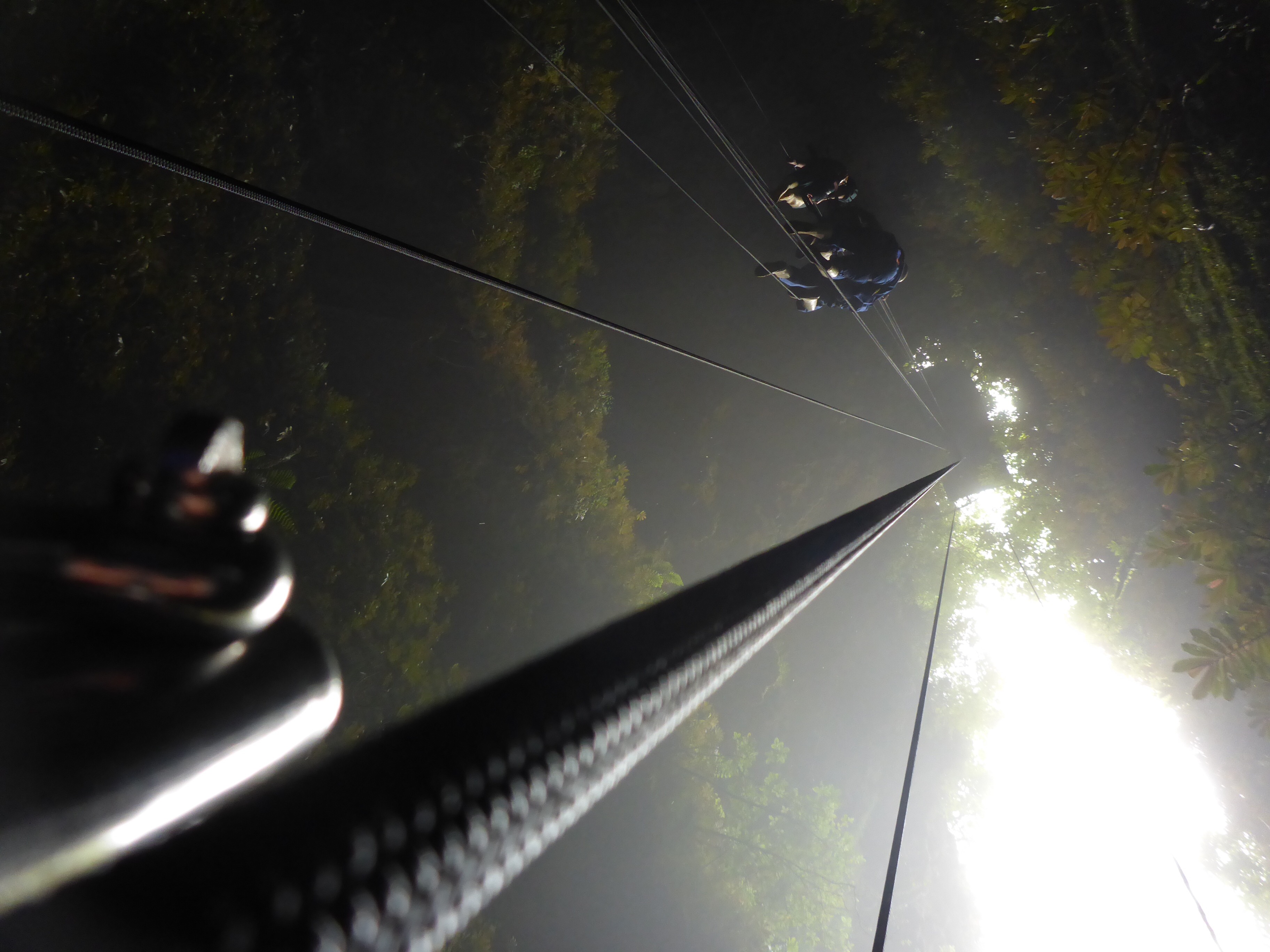 Und was für ein Gefühl, nach etwa einer Viertelstunde dann unten zu stehen. Fantastisch! Berauscht vom Abseilen (das lustigerweise im Englischen einfach „Abseiling“ genannt wird) habe ich den Rest der Tour dann in einer Art Trance erlebt. Über Fels und Stein ging es durch den Berg, durch eine bläulich schimmernde Glühwürmchenhöhle, an unterirdischen Bächen vorbei und schon war da die dreissig Meter lange Leiter, über die es senkrecht wieder nach oben ging, um ein paar Felswege und Leitern später ans Tageslicht zu kommen. Es ist wieder einmal schwer in Worte zu fassen, wie es sich anfühlt, nach so einer Tour wieder in die Welt aufzutauchen. Bislang habe ich nichts vergleichbares erlebt. Sprachlos.
